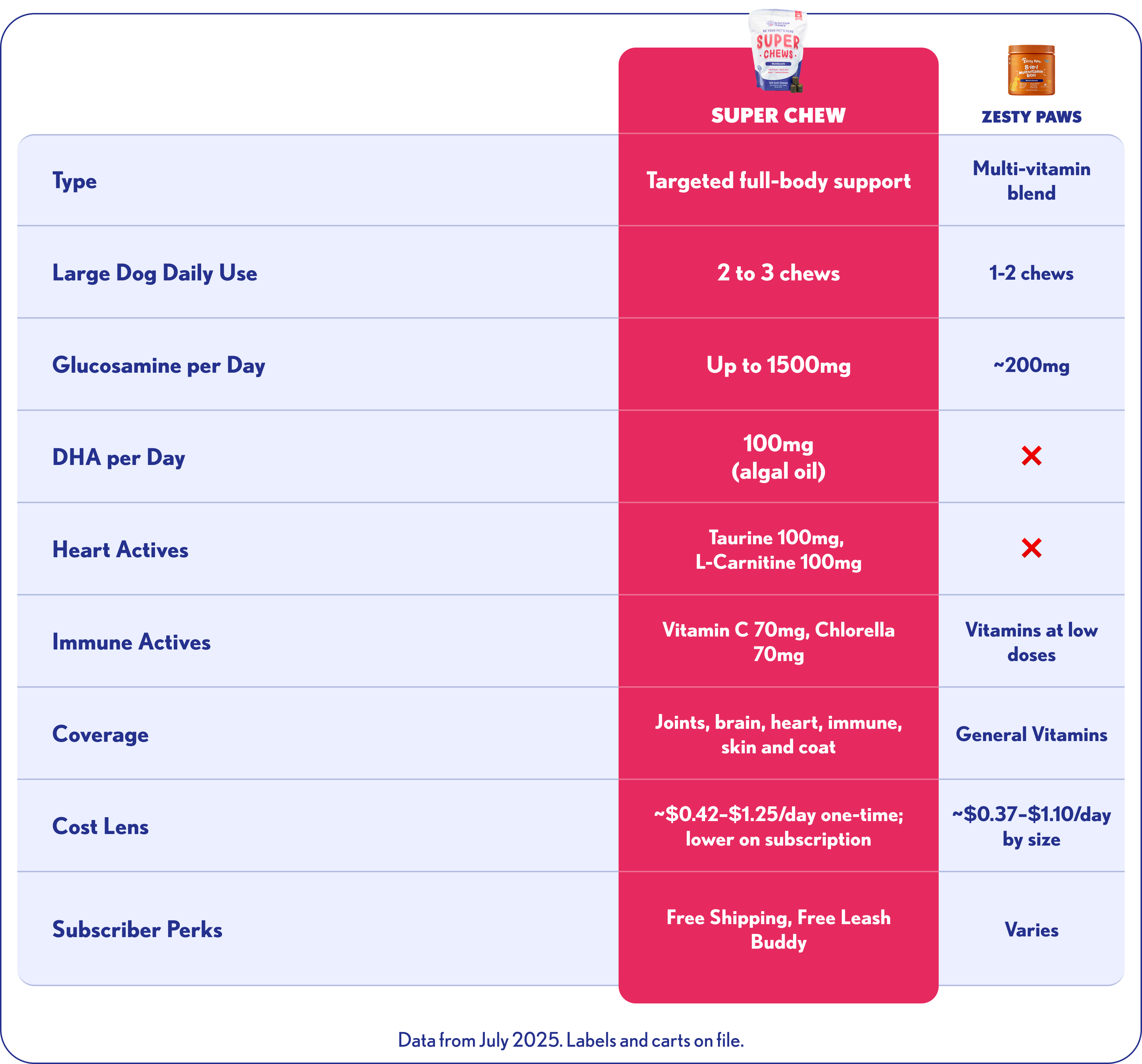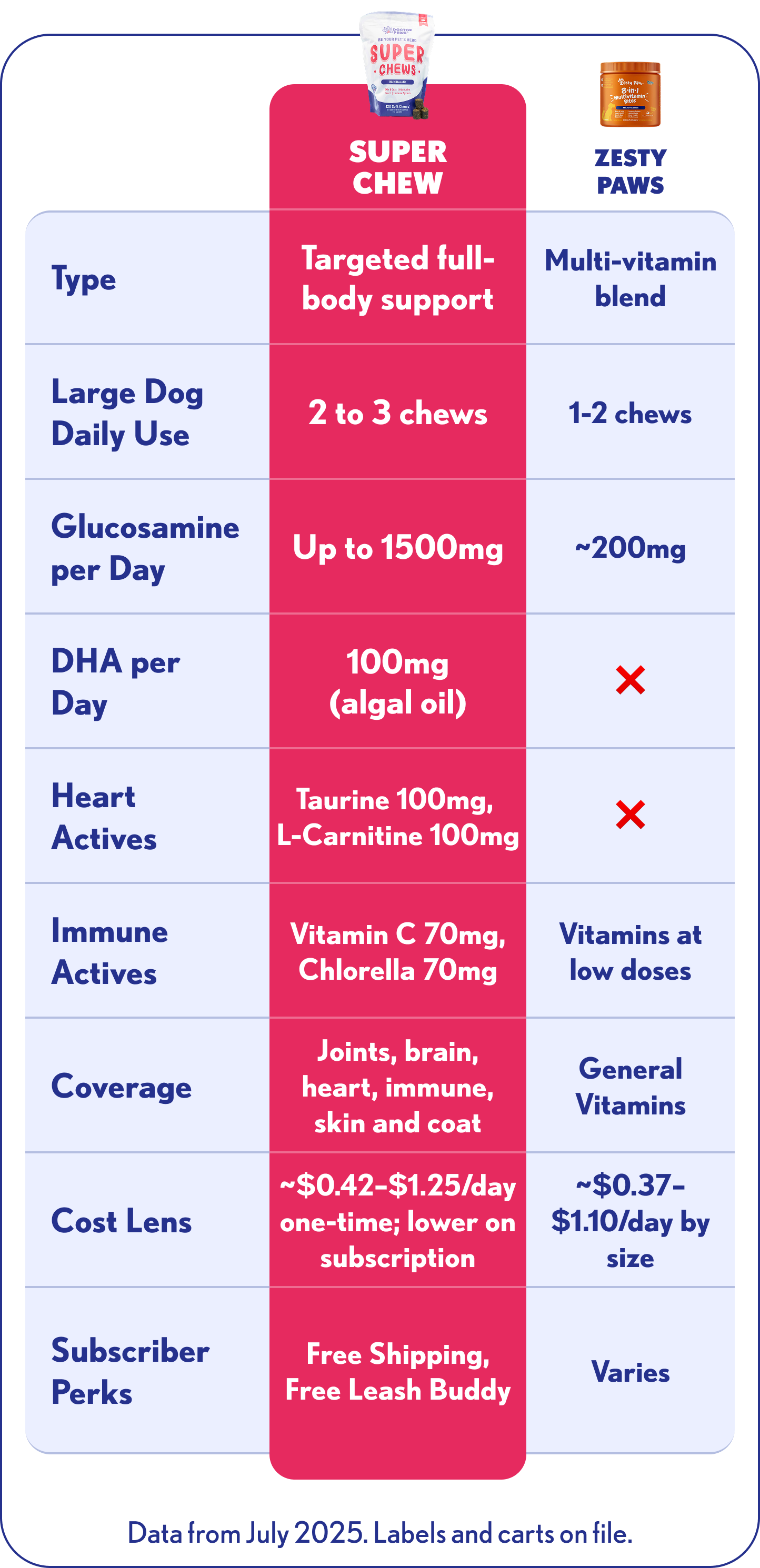 Zesty can look cheaper for some sizes, but it delivers ~200 mg glucosamine per day and skips targeted brain and heart nutrients. Super Chew often replaces a joint chew plus a “wellness” add-on with one pouch, which simplifies your routine and tightens your monthly spend.