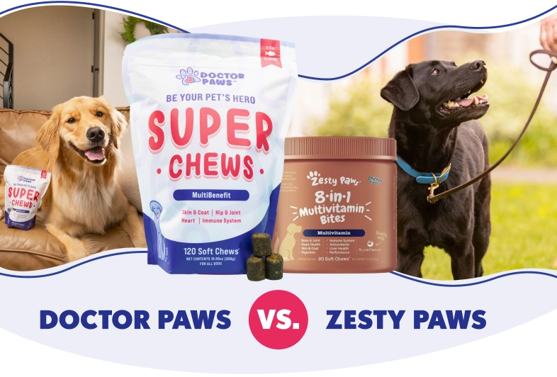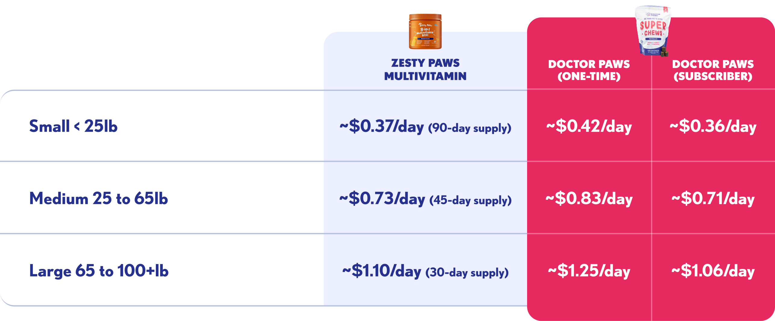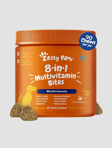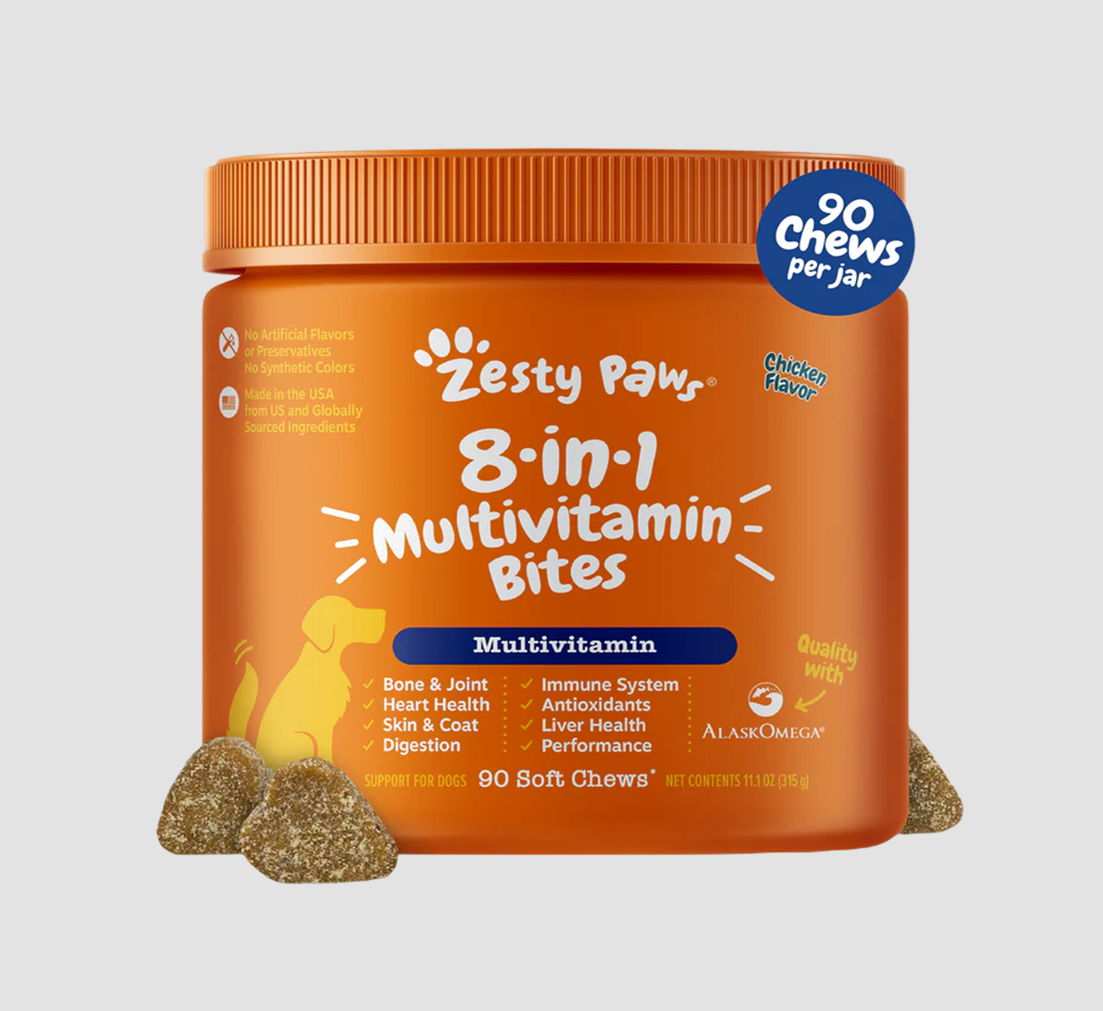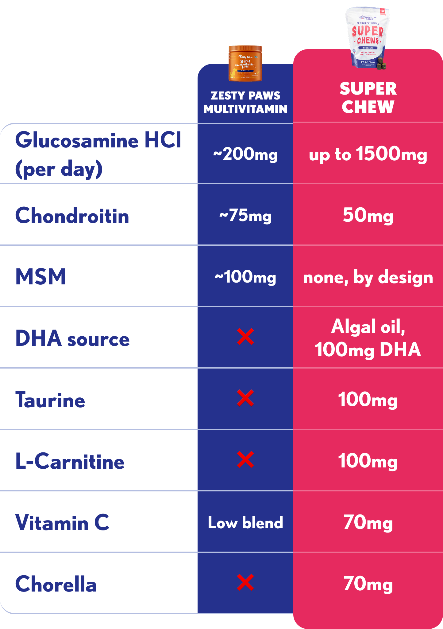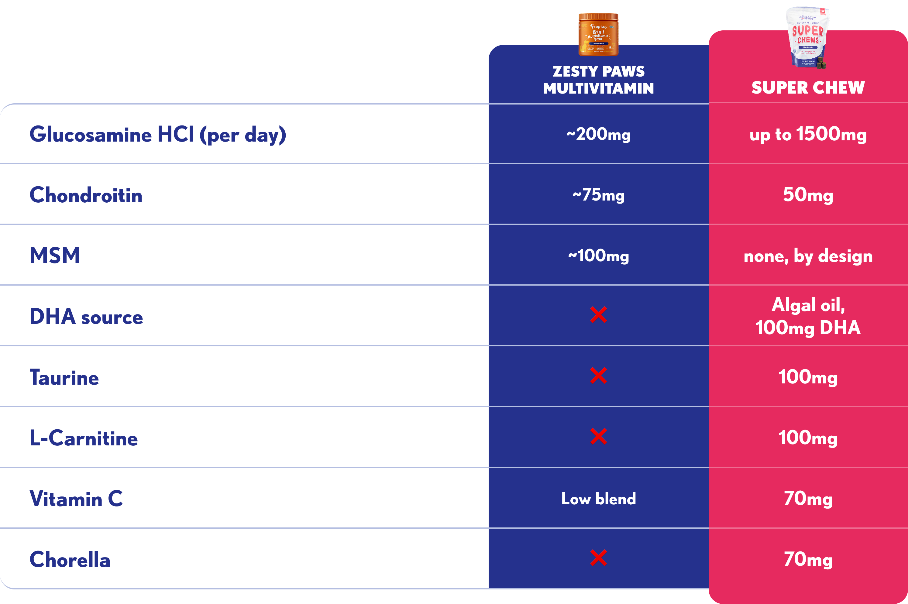 Zesty’s multi is a broad vitamin blend with low joint dosing. Super Chew delivers higher-impact joint support and adds brain, heart, and immune nutrients in one product.